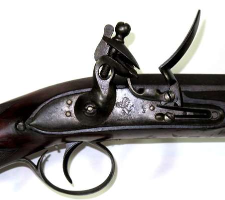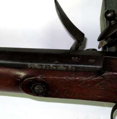 the lock plate engraved with the east India company rampant lion, ringed cock, patent cock screw, regulation two stage barrel octagonal at the breech tapering to a round flared muzzle, Hyderabad armoury proof marks, full walnut stock with chequered grip scrolled trigger guard, engraved butt plate, second form of acorn finial on the trigger guard, traces of Hindu script at the breech