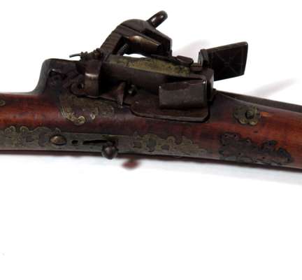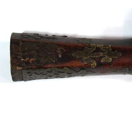 the stock decorated with applied brass pierced plaques (areas of brass missing) the barrel of hexagonal form with flared muzzle and pierced high ramp sight ball, trigger missing lock retaining screw