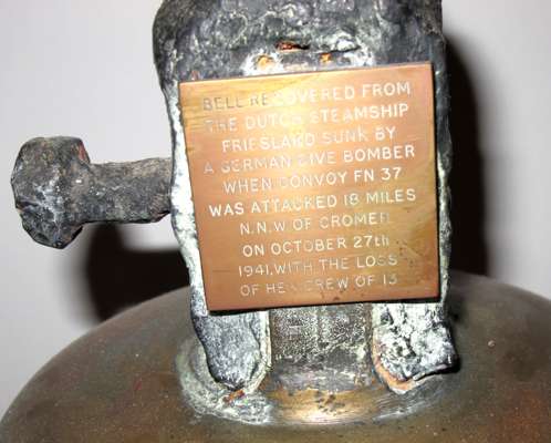 with original iron bracket, a later applied brass plate engraved “Bell from the Dutch steamship Friesland sunk by a German dive bomber when convoy FN 37 was attacked 18 miles NNW of Cromer on October 27th 1941 with the loss of her crew of 13”