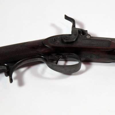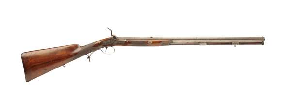 walnut half stock with horn tipped fore-end, blank silver escutcheon, platinum lines at the breech, folding leaf sights from 100 to 150 yards range, the cock with extended thumb catch, with chequered grip and fore end, raised cheek piece original hard wood brass tipped ramrod with ebony button, 12 groove rifling serial number 1651(1829-1830)