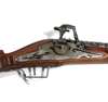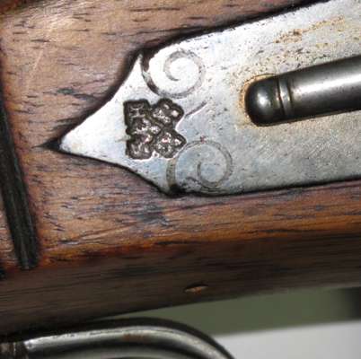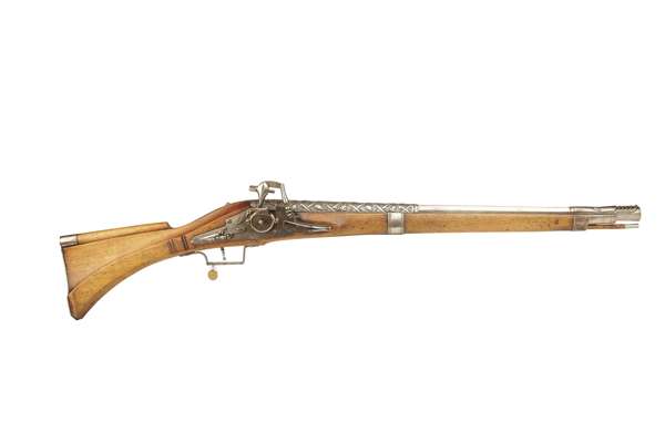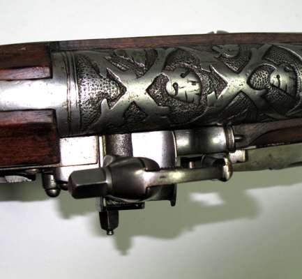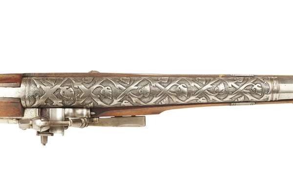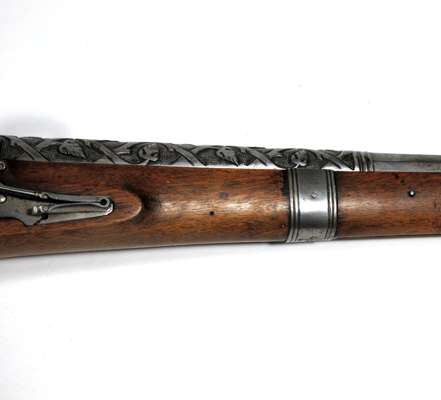 the plain lock stamped with an armourer’s mark, the three stage barrel engraved at the breech deeply cut and chiselled with lattice work foliage on a punched ground hexagonal for the next stage, the flared muzzle chiselled into five raised scales, the full stock of pale wood with a curved slender butt with a heavy steel butt plate and the trigger guard cut and shaped into four sections, with brass inventory disc with number 1087