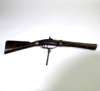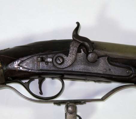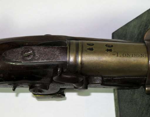 the lock with safety slide converted from flintlock to percussion, the brass barrel with flared muzzle engraved LONDON on the breech, with London gunmakers view and proof marks struck twice, well figured walnut stock with brass furniture and with rare brass swivel mount for attaching to a stage coach, brass trigger guard with acorn finial blank brass escutcheon