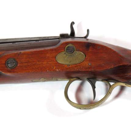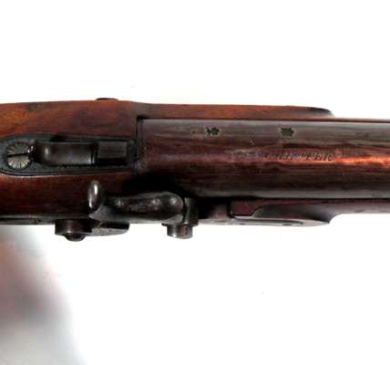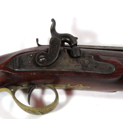 the lock signed Shaw, the hammer signed Conway, converted from flint to percussion, steel barrel with flared muzzle signed Manchester with 8in. (20cm) spring, engraved brass trigger guard with unusual triple headed finial, walnut full stock with chequered grip, with original brass tipped ramrod, Birmingham proof marks
