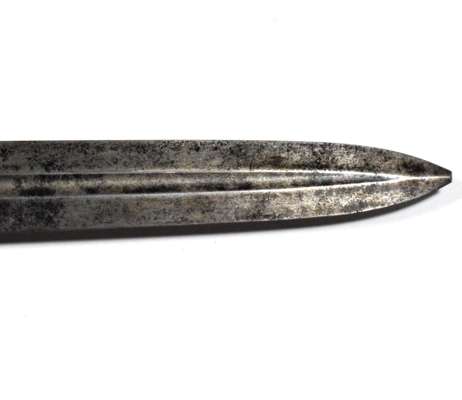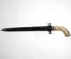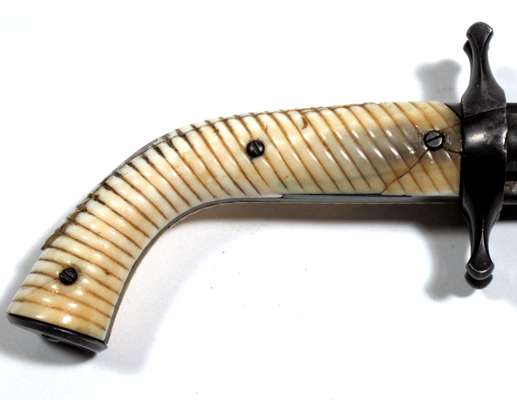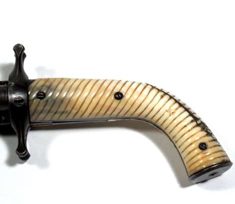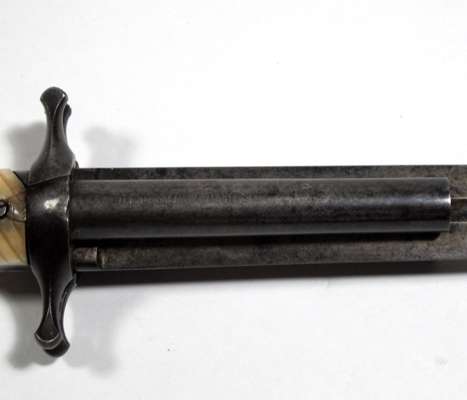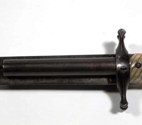 with the barrels either side of the dagger blade, slab sided bone grips attached by three screws and with incised lines (damaged), the quillions act as cocking hammers, cocking the RH barrel drops the folding trigger but the LH barrel has no trigger and is operated by lifting and dropping the hammer, barrel signed Devisme a Paris