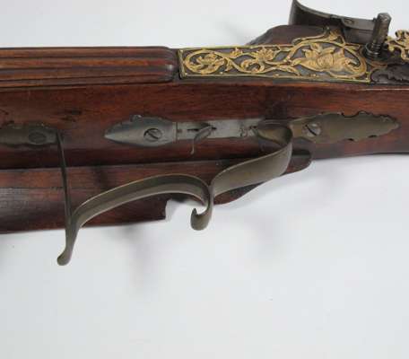 the plain lock and cock overlaid with fine cut brass formed and engraved in tulip heads and foliate scrolls, heavy octagonal six grooved rifled barrel struck with a prancing lion and an intertwined cypher SF, set trigger, full walnut stock with low relief carved foliate scrolls on the butt, the patch box carved with raised moulding with the ramrod pipes and fore-end of horn, butt plate with a steel resting spike