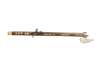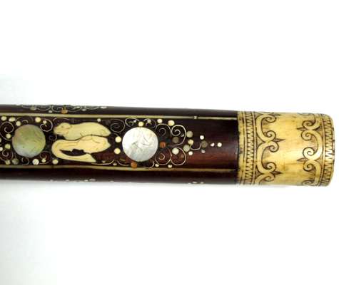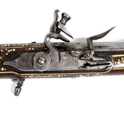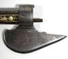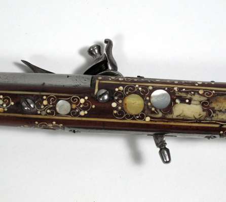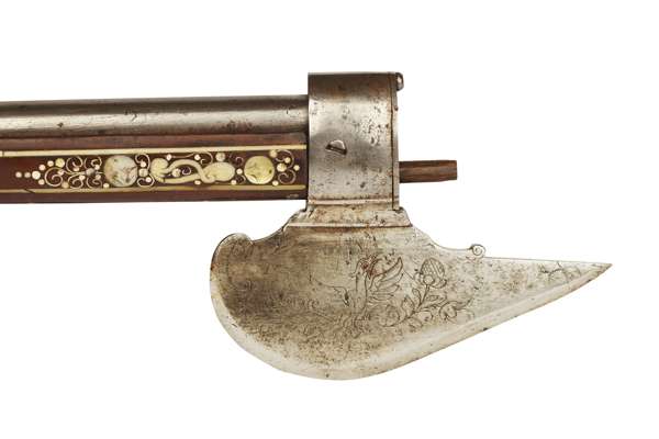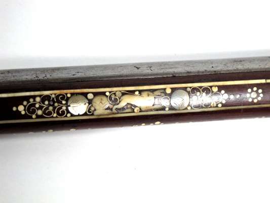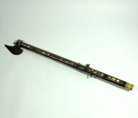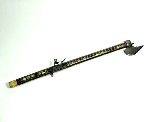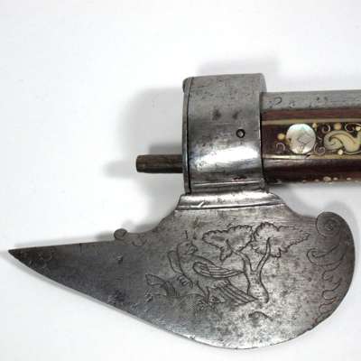the plain lock with projecting seer, shaped cock attached from inside the lock, the pommel of turned ivory engraved with scrolls and panels (missing its pommel cap), the stock profusely inlaid with mother-of-pearl and bone animals of the chase, including deer and hare, with tendrils decorating the underside of the stock, on a russet background the leaf shaped axe blade chamfered on one side and with a sharp point, etched with a ho ho bird on one side and a parrot on the reverse