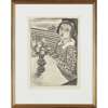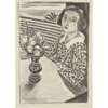 Seated Young Woman with a Bouquet of Flowers reflects Matisse's key interests in print-making. The subject is a young woman, surrounded by decorative patterns. He creates a bold composition, by angling different patterns against each other. There are the expected visual patterns - the floral pattern in the sitter's blouse, and on the vase, and the bold horizontal striping of the blinds behind her, but these are juxtaposed with patterning created by the artist to add depth and texture, his graphic mark-making in the table surface and the distant sky. It has been suggested that even when working in monochromatic prints, Matisse's works have the sense of being colourful. That is true here. We can easily imagine the bold colours that would feature in an oil painting version, especially in the bold patterning, yet the monochromatic simplicity allows Matisse's compositional insight, and ability to manipulate the qualities of lithography, to really shine.