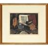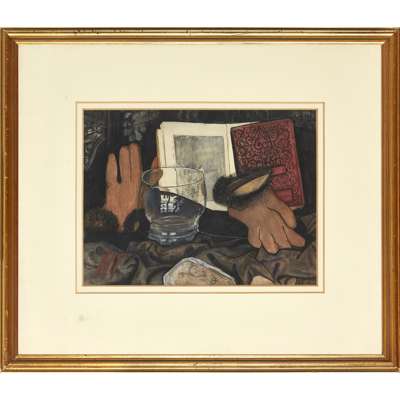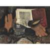 STILL LIFE WITH GLOVES, GLASS AND BOOK