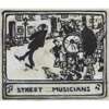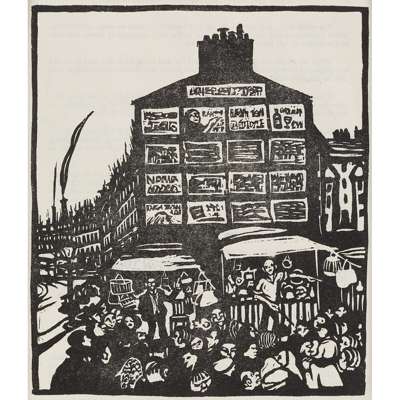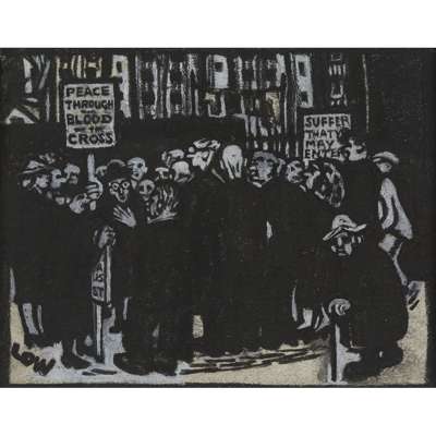 'Street Musicians', pastel and gouache, 14cm x 16cm (10in x 6.25in); 'Street Protestors', signed, pastel and gouache, 11.5cm x 16cm (4.5in x 6.25in); 'The Barras', linocut, 17.5cm x 15cm (6.75in x 6in)