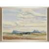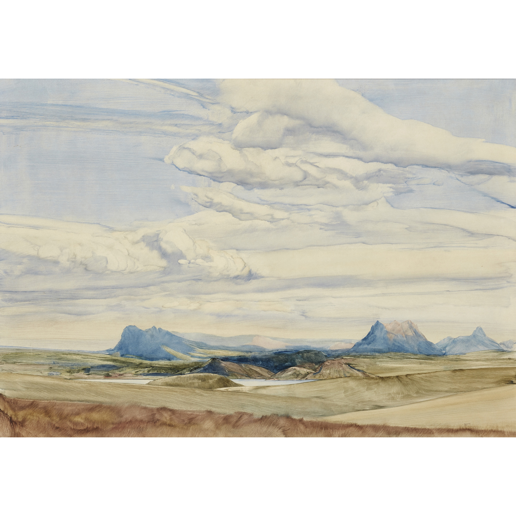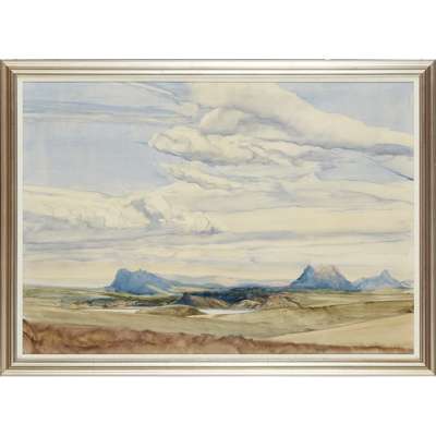 James Morrison was born in Glasgow in 1932 and attended Glasgow School of Art from 1950 to 1954. This group of four oil paintings, all signed and dated by Morrison, exemplify the panoramic vistas and dramatic skyscapes which the artist is renowned for. In the canon of Scottish art landscape painting has been a symbol of Scottish identity since the eighteenth century and Morrison follows this tradition by exploring the diversity of his native country, drawing inspiration from the remote ruggedness of the West Coast to the rolling fields around his home in Angus where he settled in 1965. The painting, Mountains, Sutherland (1990) depicts a dramatic peak studded landscape cast in partial shadow by a vast sky filled with billowing clouds. Morrison's descriptive title reflects the faithful naturalistic representation of the northern county's sweeping moorlands and dramatic geological formations. These paintings were initially executed en plein air and then later finished in the studio which enabled Morrison to record each distinct season, weather or light. However, to describe Morrison as a realist would be to oversimplify his style. The variety of mark making in Morrison's works subtly reveal the artist's hand reflecting the impact of the European and American avant-garde who in the 1950s and 1960s were experimenting with a more expressive style of painting. Morrison works back into the painting by wiping away washes of colour to reveal the white gesso ground applied underneath in order to give the clouds their bright appearance and create an illusion of solidity against the opaque blue grey sky. Morrison's also evokes the variety of textures in the natural landscape by using directional brushstrokes to suggest the movement of wind through the tufts of long grass in the foreground. These gestural marks add a degree of abstraction into Morrison's landscapes which enable him to bridge the gap between the tradition of Scottish landscape painting and a contemporary expression of artistic individuality.