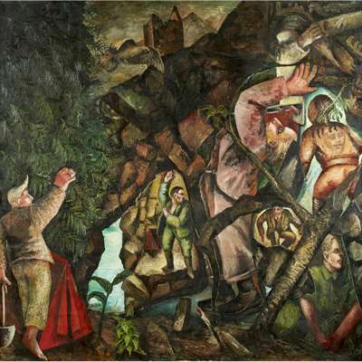 Young Camper Discovering Grotto in The Ground is a major work representative of this period. It appeared in a solo show held at the Barbara Toll Gallery in 1983. Within days of the show, the doyen of the New York art critics, John Russell, fully endorsed the painterly qualities of a young, unknown Scottish artist in his New York Times review. From here it was purchased by significant US contemporary art collectors, Boake and Marian Sells.