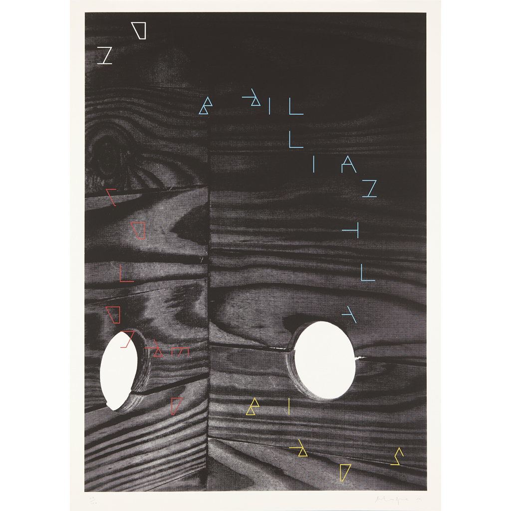 Continuing Boyce's interest in the ‘collapse of nature and architecture’ and interior and exterior forms, this print references the empty wooden interior of the artist's bird box sculpture in the vacated Italian Palazzo; the holes in which simultaneously suggest the form of a head or mask. During the development of this project Boyce drew from a short text he had written with an abandoned zoo in mind: ‘warm dry stone and palm leaves, no elephants, no giraffes, no penguins, no brilliantly coloured birds…’.