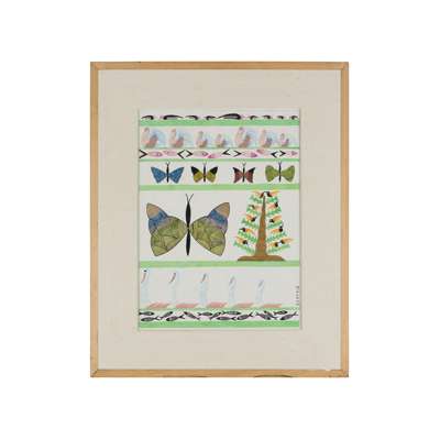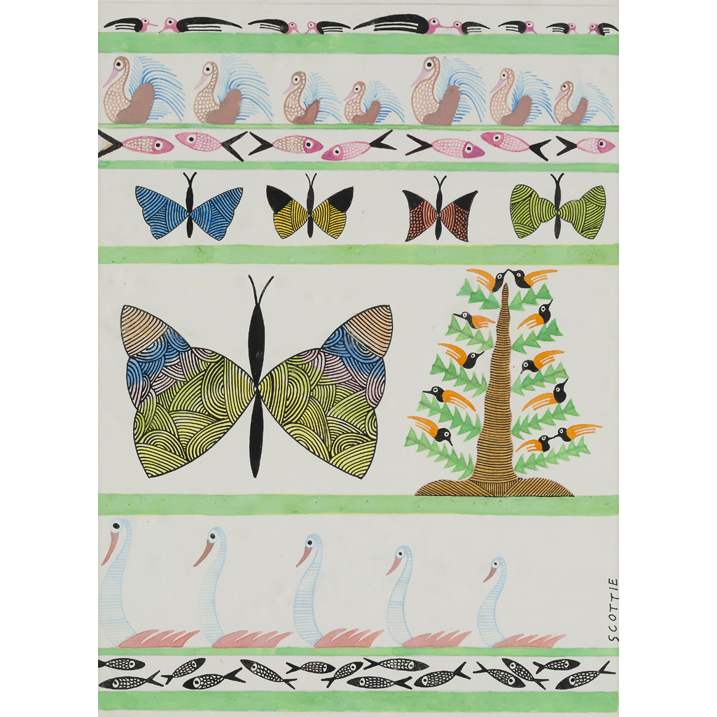 Note: Scottie (Robert) Wilson was born in Glasgow. He joined the army at the age of sixteen, serving in India and South Africa and also lived in Canada for fifteen years from 1930. A self-taught artist, Wilson began to draw in the 1930s and held his first solo exhibition in Toronto in 1943. On returning to Britain, he became a well-known character on the London art scene. Wilson’s distinctive drawings are decorative and fantastical. His favourite motifs include stylized fish, birds, flowers, trees, self-portraits and totem pole-like symbols. Preferring to use crayon, pen and ink as they allowed him to work quickly, he also experimented with gouache. Wilson’s work was admired by the Surrealists and by Jean Dubuffet and Picasso.