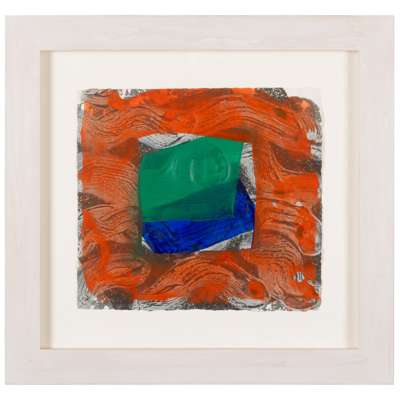 In 1986 he began working with Jack Shirreff, who introduced Hodgkin to the combining of techniques such as lift-ground aquatint and the relatively new medium of carborundum. This added a richness to his prints, with the carborundum enabling a transference of both the inked image and surface texture to the sheet through a process of embossing, with varied depth and intensity across the plate. However the most significant evolution was the approach to hand colouring. Historically this would have been the application of watercolour or gouache at the end of the printing process, either because the technology for colour printing wasn’t available or to simulate the appearance of a unique work on paper. True to irreverent form, Hodgkin turned this on its head by utilising hand colouring at any stage of the printing process, either as a starting wash, between print layers or at the end. This makes the distinct layers difficult to distinguish in the finished work and brings a luminosity and lushness. Hodgkin subverts this technique even further, as the hand colouring is never by his hand: he delegates this part of the process to someone else, a technician or friend. He often doesn’t even demonstrate what he wishes but offers instructions instead; on the thickness of the brush, volume of pigment and the intensity of the application, using poetic instructions including ‘like a silk-stocking’, ‘like a whisper’ or ‘like a bold explosion’. This allows a distance to be maintained between the artist and the print, simultaneously drawing both closer to, and further away from, painting, even as Hodgkin retains control of the finished print when he approves and marks the final editions.
