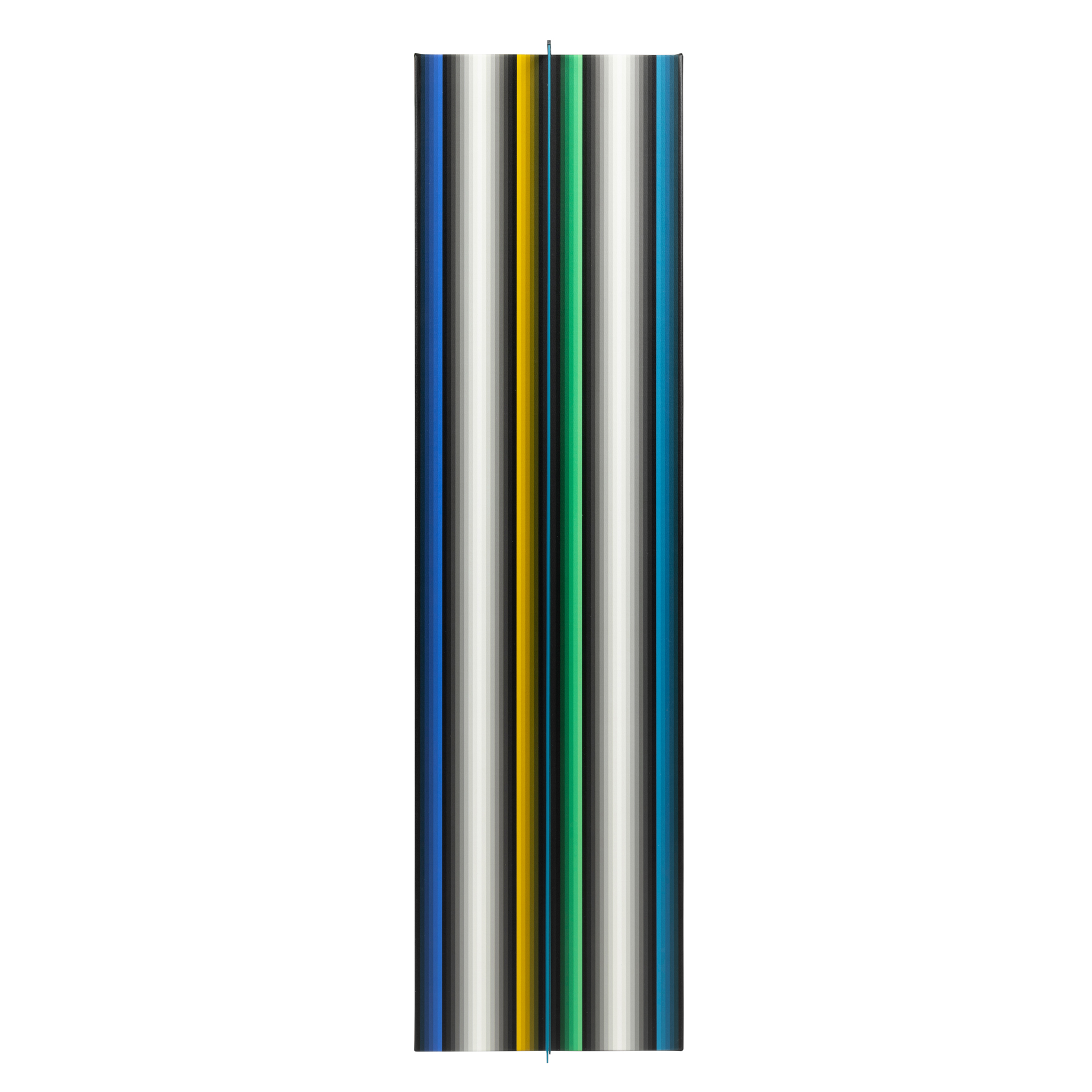 Pérez-Flores’ early artworks were generally sculptural, but from the 1980s he began to create paintings and assemblages referred to as Chromatiques and Prochromatiques. Bright and boldly contrasting pigment was applied in thin vertical lines across the composition, each slice of colour either applied in gradient or as a solid hue. Pérez-Flores’ polychromatic stripes were arranged in such a way that they appear to shimmer and vibrate or to catalyse new shapes and colours in response to the viewer’s gaze. Later in his career, Pérez-Flores embellished his paintings with three-dimensional vertical metal rods to add a physical kineticism to enhance the optical sense of movement.