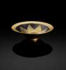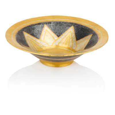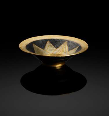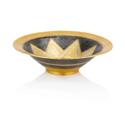 Waterhouse wrote: 'This is a hand-raised bowl decorated with pure gold and varying alloys of Green and White Gold. The pattern has been applied using the Korean technique Keum Boo which involves fusing metals together using only heat and pressure. This has been done when the main body of the bowl is flat and with alloys of green and white gold created by myself.