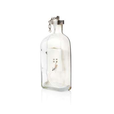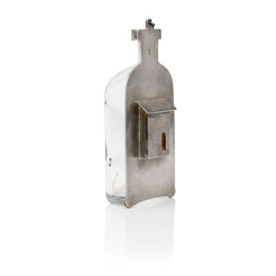 “To combine glass and silver in a quirky way, I cut the glass bottle into two halves geometrically, and then sealed the opened side with a piece of silver, which was inserted with an elaborately hand-made miniature form, such as: a little house, a mini chest of drawers or a tiny decorative vase.”