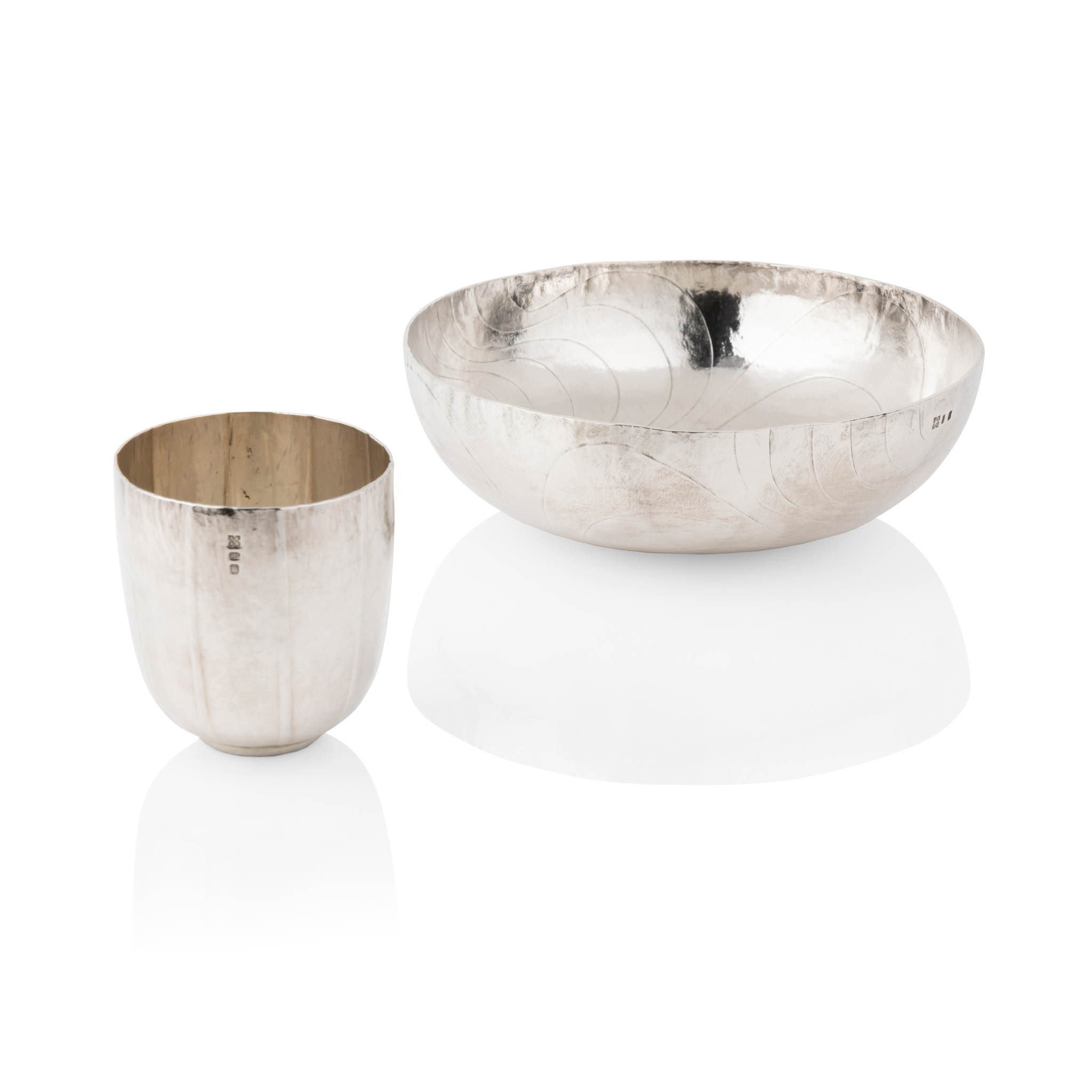 the bowl: 4.7cm high, 15.5cm diameter (1 7/8in high, 6 1/8in diameter), 353 grams; the beaker: 7cm high (2 ¾in high), 101 grams (2)