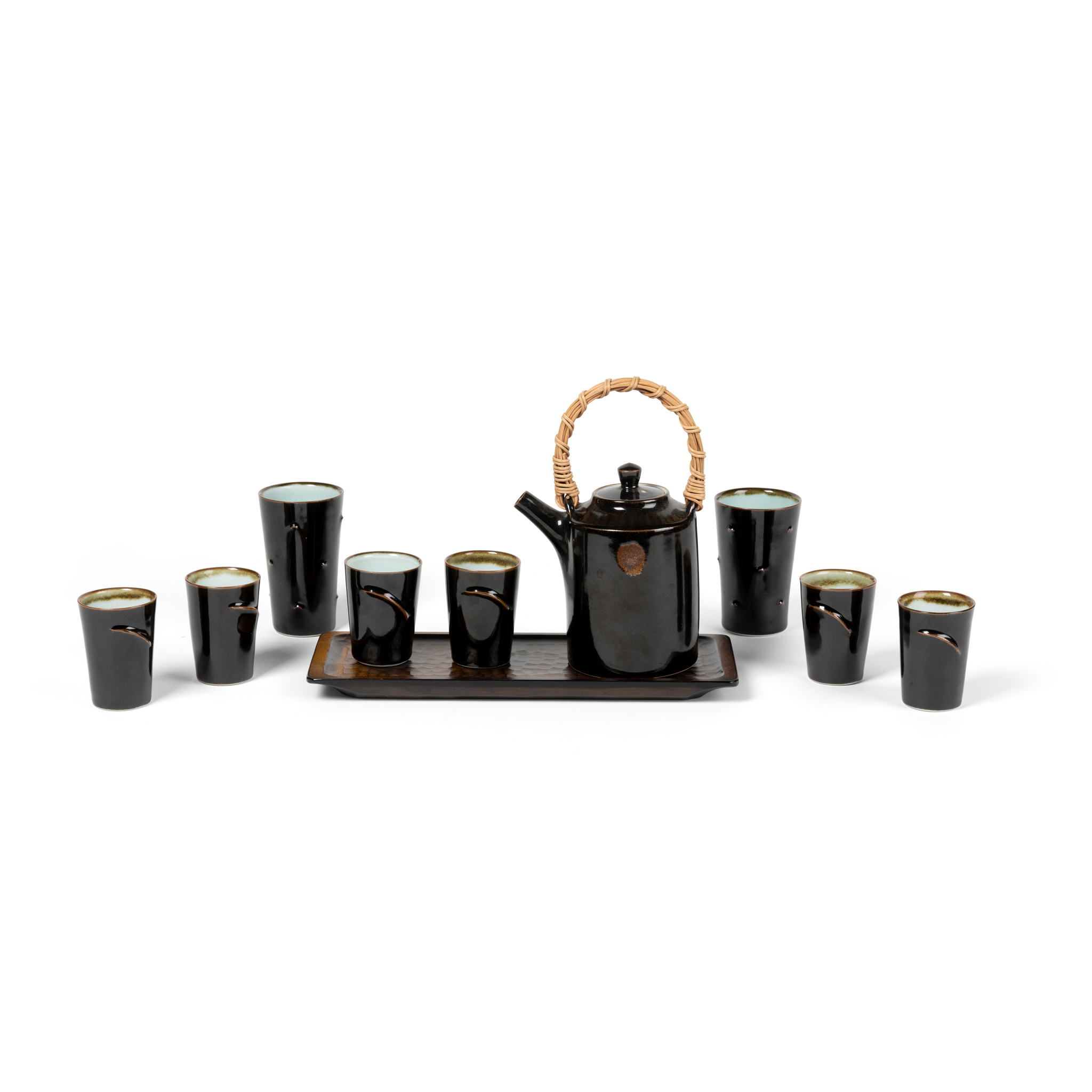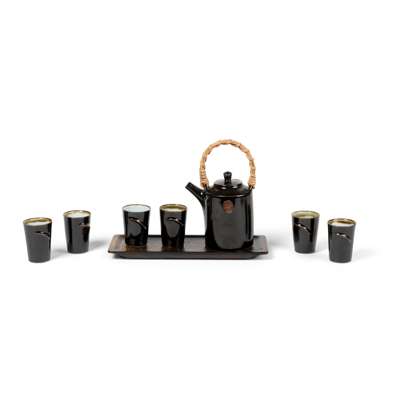 comprising teapot, six small beakers and two larger beakers, each with impressed maker's seal, porcelain, tenmoku, with carved wooden tray
