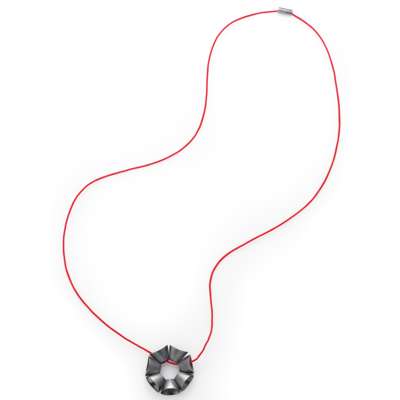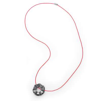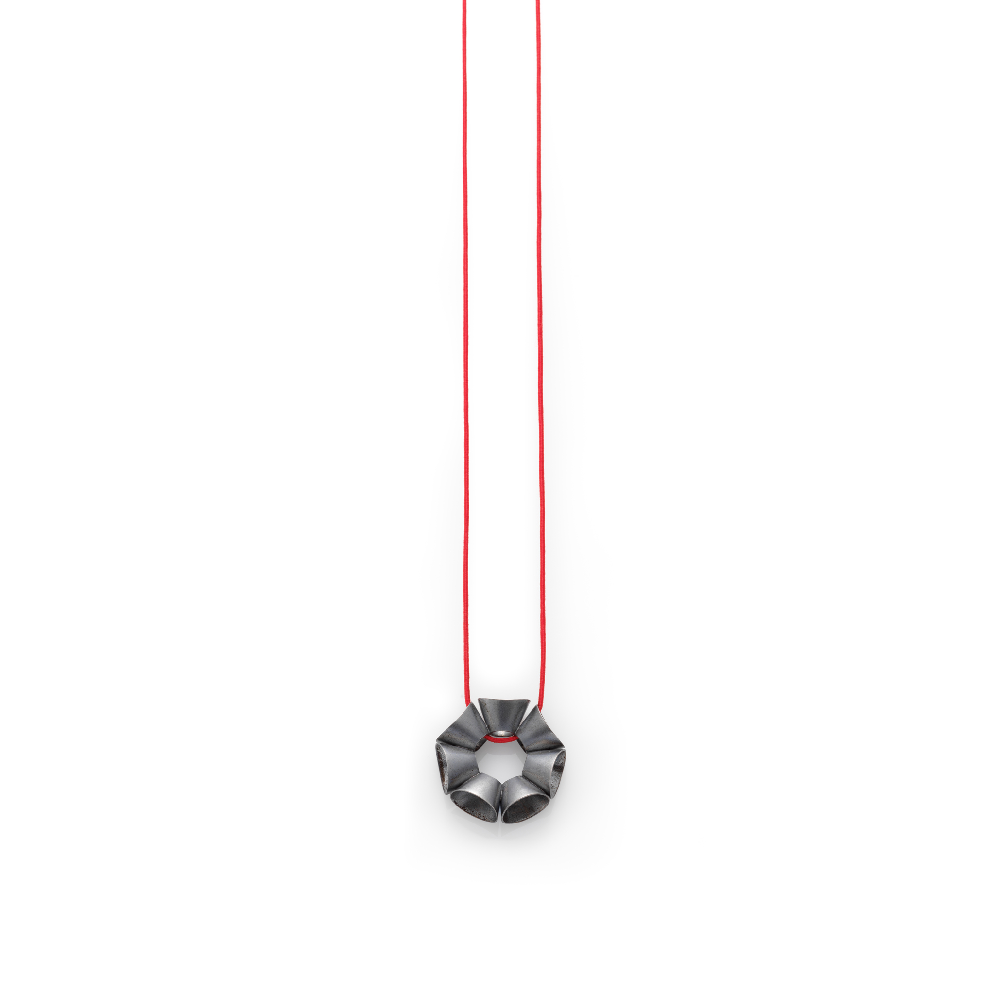 oxidised white metal on red cord, from 10 year retrospective at the Scottish Gallery