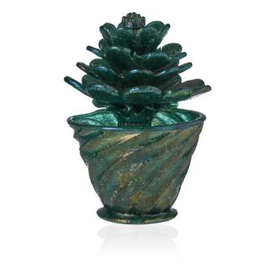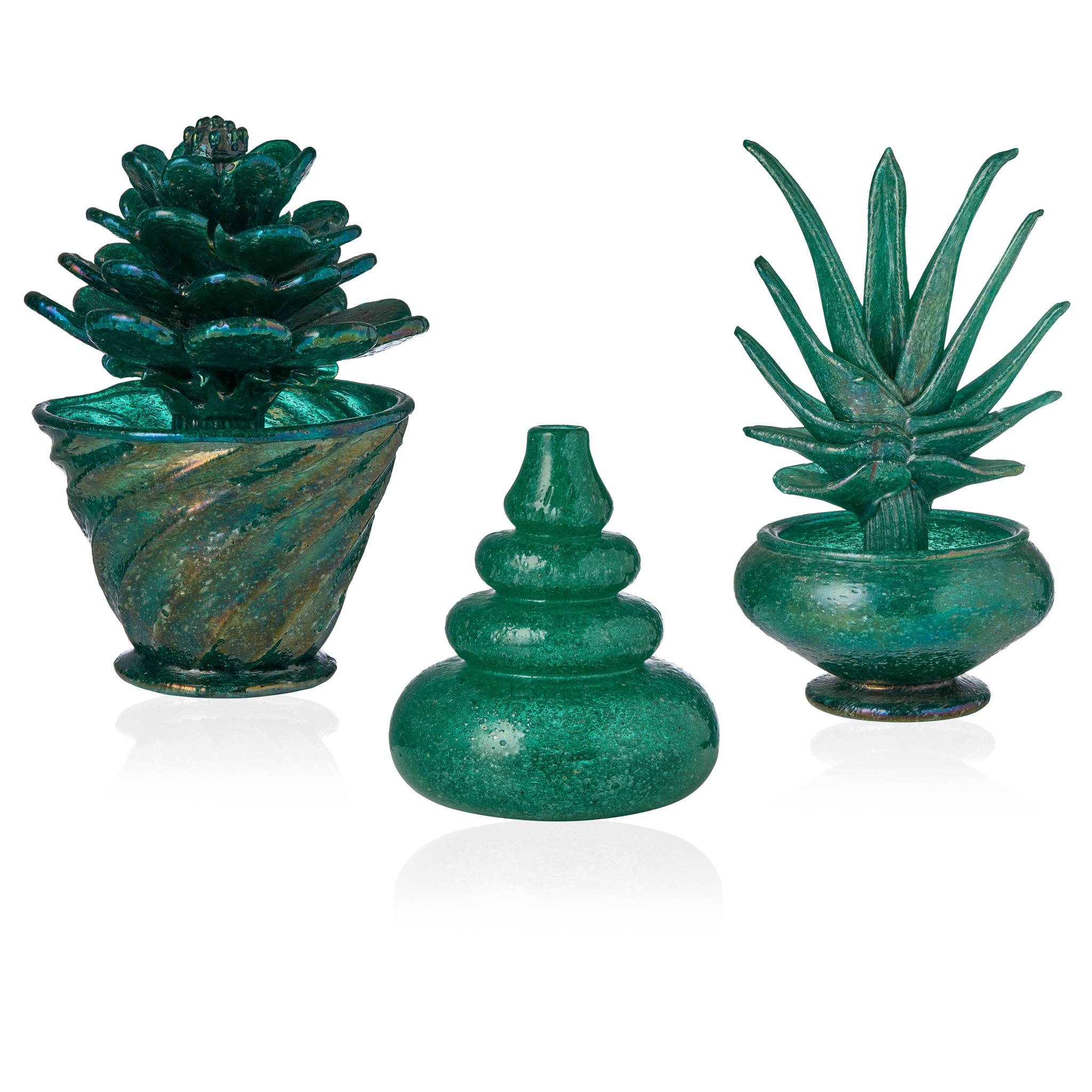 hand-blown and applied glass, with iridescent wash, comprising a 'Pulegoso' Succulent, 19cm high (7 ½in high); another 'Pulegoso' Succulent, 19cm high (7 ½in high); and a ‘Pulegoso' Vase, 12.5cm high (4 7/8in high) (3)