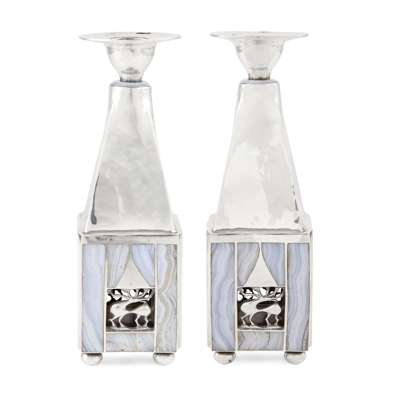 each stamped Goudji Paris Sterling 925G, silver and blue agate, the square bases with stag motifs to both sides