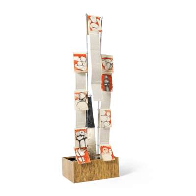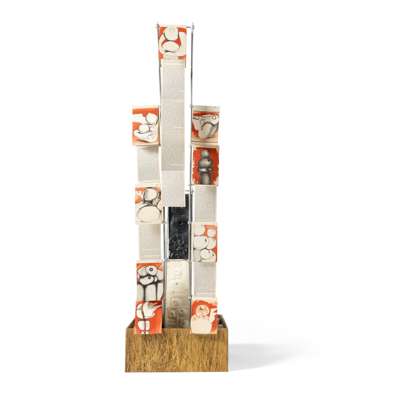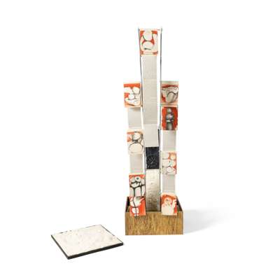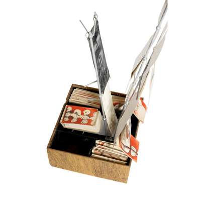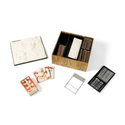stamped M (lower left), portfolio with wood box and containers, plastic molded sculptural multiples & associated metal hanging elements