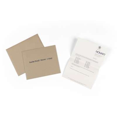 HOWARD HODGKIN - BLUE SKIES, NOTHING BUT BLUE SKIES, 2002, screenprint in colours, scrunched up in presentation card box, from the un-numbered edition of 500; DAVID HOCKNEY - COMPOSITION RED & BLUE 2005, lithograph printed in colours on wove paper, in the original blue card portfolio with embossed cover; LUCIAN FREUD - ENCORE, 1949/2003, offset lithograph, mounted in folded buff card in matching envelope; all accompanied with relevant letters from MOMART