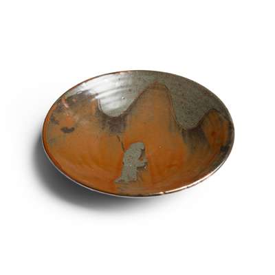 impressed maker’s and pottery marks, stoneware, with wax resist design of Pilgrim walking through the mountains