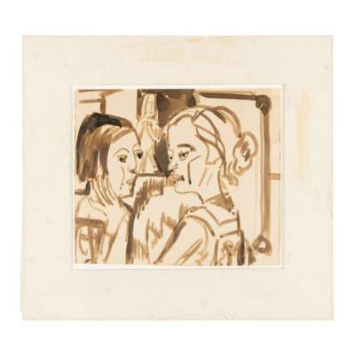 In Zwei Frauen im Gesprach Kirchner shows his mastery of brush and ink, which perhaps could be said to be the medium of German Expressionism. The brush allows for bold, jagging lines and an emphasis on outline over shading, as sculpting the figures on paper as they would with chisels out of wood; and the ink allows for speed – an idea as modern as modern can be. Brush and ink allows spontaneity, a definitiveness of gesture, that Kirchner, Heckel and fellow members of Die Brücke honed in their ‘quarter-hour’ life drawing sessions, where working quickly became analogous to working without premeditation – or as Jill Lloyd puts it, speed of execution becomes an ‘attempt… to catch modernity on the wing’. (Jill Lloyd, German Expressionism: Primitivism and Modernity, Yale University Press, New Haven & London, 1991, p.45)