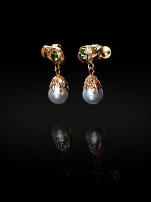 hallmarked, 9ct gold, tourmaline and pearls, each collet-set with a round-cut green tourmaline in a tapering, textured surround; suspending a cultured pearl drop from a textured gold cap, post and butterfly fittings