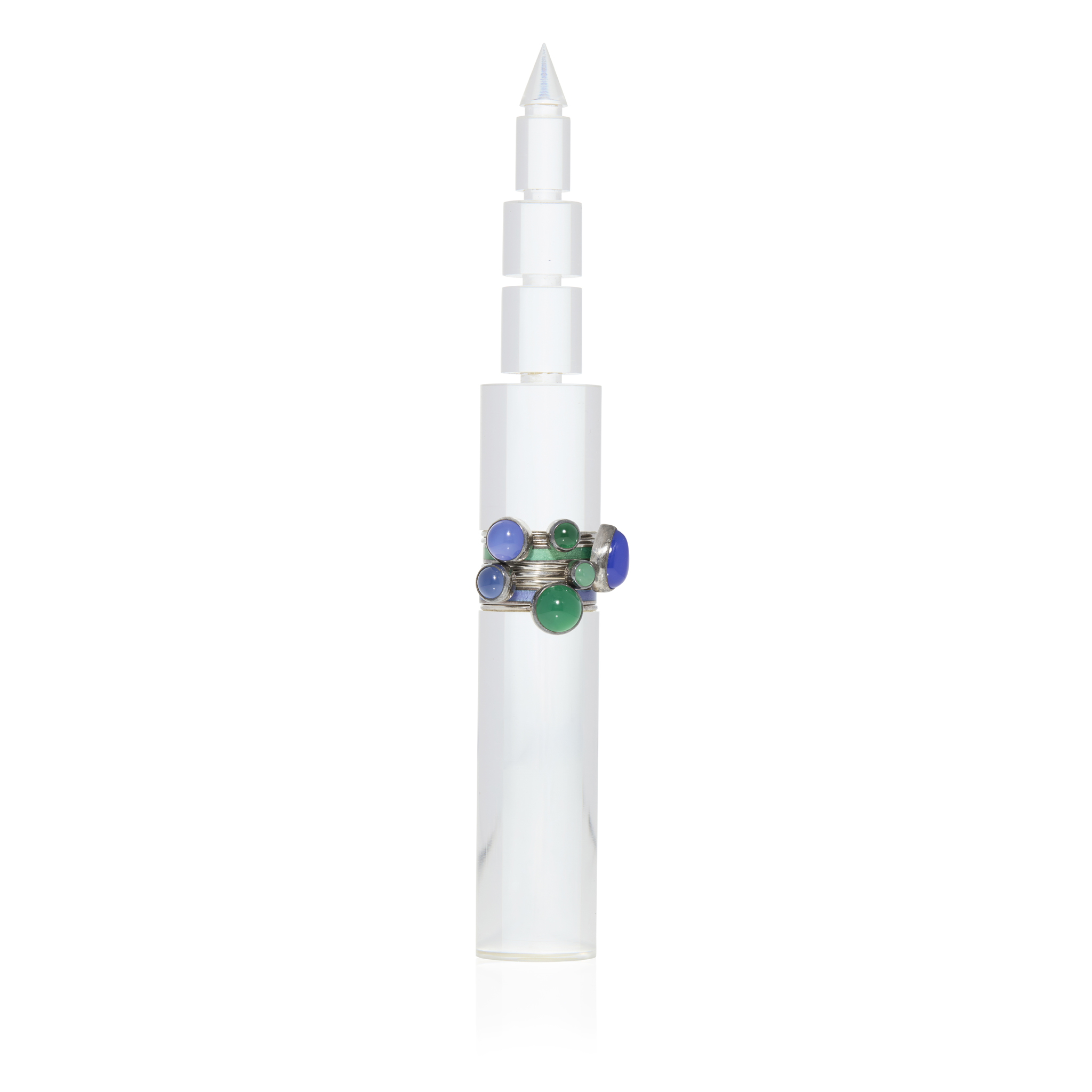 comprising two green and blue enamel bands and five rings collet-set with cabochon blue and green carnelians, stamped maker's mark, hallmarked for London 1989, the enamel bands unmarked, silver, on a perspex display stand
