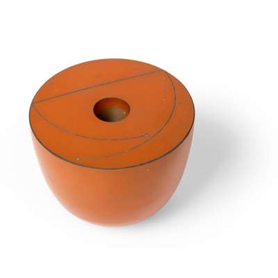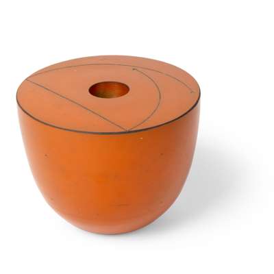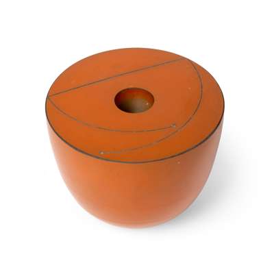 incised signature and date, porcelain, terra sigillata slip in orange, the top surface with linear design