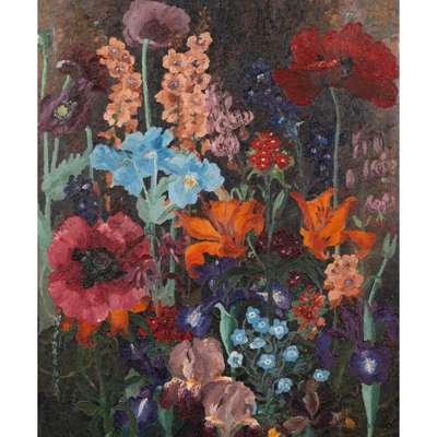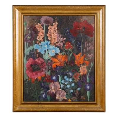 The Blue Poppy brings together Morris’s triumphs in the studio and in the garden of this exceptionally creative period. It may have been painted to celebrate his success in bringing the titular Himalayan Blue Poppy (Meconopsis baileyi) to flower, seen at the upper left of centre of the canvas. It was not introduced into cultivation in the UK until 1924, just eight years before the work was created and takes three to four years to nurture from seed to growth to bloom. This particular poppy represents, amongst other things, peace, purity, spirituality and harmony with nature. Other species thought to feature in the painting include the red Oriental Poppy (Papaver orientale Goliath Group), the lilac-purple Opium Poppy (Papaver somniferum), Chinese Delphinium associated with chivalry, bravery and fidelity and Fire Lily associated with purity and majesty. Applying thick paint in distinctive brushstrokes onto canvas, Morris presented a range of brilliantly coloured flowers in the frontal plane, against a dark background. The variously shaped flowerheads, petals, stems and leaves are realised with the strength of form of an artist and the understanding of a horticulturalist.