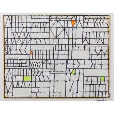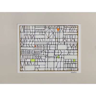 signed in pencil (centre left), signed in pen in margin (lower right), pen, ink, gouache and collage