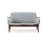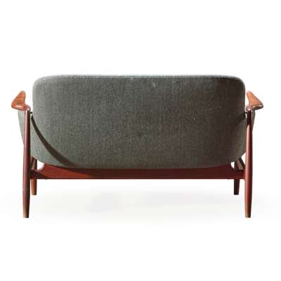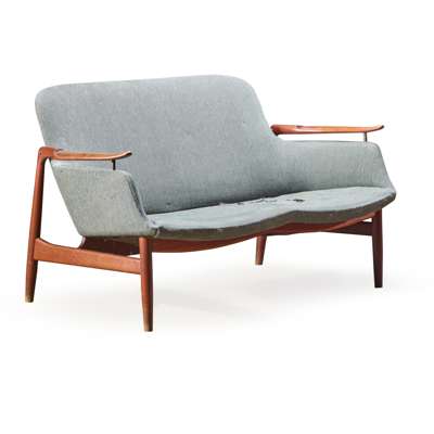 Collaboration with master craftsmen was central to Juhl’s method, and nowhere is this more evident than in his partnership with Niels Vodder, whose initials are immortalised in the NV53 series. The chairs and settee of this family (Lots 227 and 228) achieve a balance between enveloping upholstery and the visual lightness of a refined wooden frame, revealing the technical sophistication that lay beneath Juhl’s fluid silhouettes. Ornament, when it appeared in his work, was typically sparing but deliberate: the so-called Judas Table (Lot 54), with its inlaid sterling-silver discs, exemplifies his ability to imbue functional objects with a note of theatricality that remains understated rather than ostentatious. This sensitivity to scale carried through to larger commissions such as the BO64 sofa (Lot 232), where the wooden framework supports the upholstery with the same sculptural poise found in his single chairs, but reimagined as a communal, room-defining presence. Its biomorphic contours further reveal the influence of contemporary sculptors he admired, including Jean Arp and the Icelandic artist Sigurjón Ólafsson. By the mid-1950s, Juhl had also begun to adapt his language to industrial production, most notably with the France Chair (Lot 59) for France & Son. Retaining his distinctive “floating” seat and back while answering the demands of export markets, it demonstrated how his vision could be carried to an international audience without loss of integrity. Taken together, these works affirm Juhl’s place as both an innovator and a mediator between craft, artistry and industry, qualities that ensured his influence within Denmark and far beyond.
