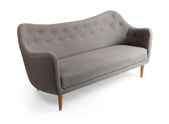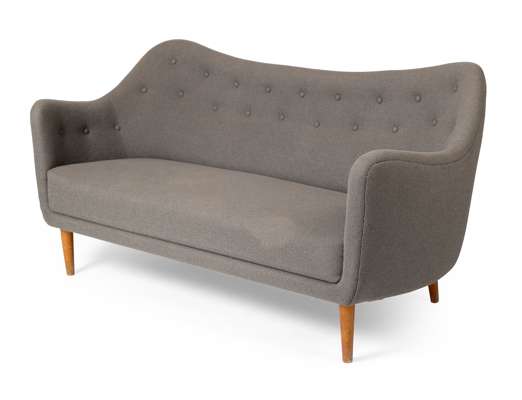 Collaboration with master craftsmen was central to Juhl’s method, and nowhere is this more evident than in his partnership with Niels Vodder, whose initials are immortalised in the NV53 series. The chairs and settee of this family (Lots 227 and 228) achieve a balance between enveloping upholstery and the visual lightness of a refined wooden frame, revealing the technical sophistication that lay beneath Juhl’s fluid silhouettes. Ornament, when it appeared in his work, was typically sparing but deliberate: the so-called Judas Table (Lot 54), with its inlaid sterling-silver discs, exemplifies his ability to imbue functional objects with a note of theatricality that remains understated rather than ostentatious. This sensitivity to scale carried through to larger commissions such as the BO64 sofa (Lot 232), where the wooden framework supports the upholstery with the same sculptural poise found in his single chairs, but reimagined as a communal, room-defining presence. Its biomorphic contours further reveal the influence of contemporary sculptors he admired, including Jean Arp and the Icelandic artist Sigurjón Ólafsson. By the mid-1950s, Juhl had also begun to adapt his language to industrial production, most notably with the France Chair (Lot 59) for France & Son. Retaining his distinctive “floating” seat and back while answering the demands of export markets, it demonstrated how his vision could be carried to an international audience without loss of integrity. Taken together, these works affirm Juhl’s place as both an innovator and a mediator between craft, artistry and industry, qualities that ensured his influence within Denmark and far beyond.