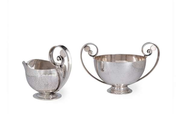 model numbers 321A and 321B, each stamped manufacturer's mark and model number and the sugar bowl stamped DENMARK / STERLING, the sugar bowl with British import marks for 1931 and the cream jug with import marks for 1927