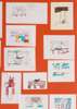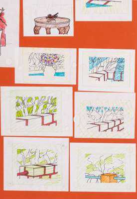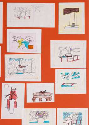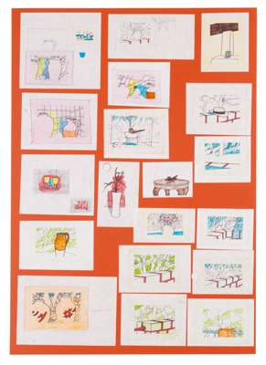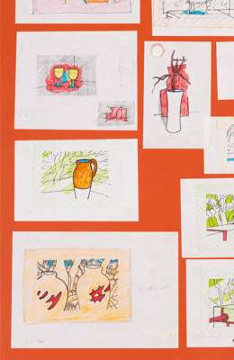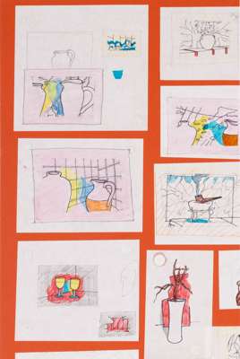 one inscribed signature pots in pencil, pencil, felt tip, pen, ink and crayon, all mounted together on red card