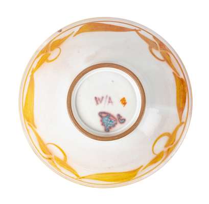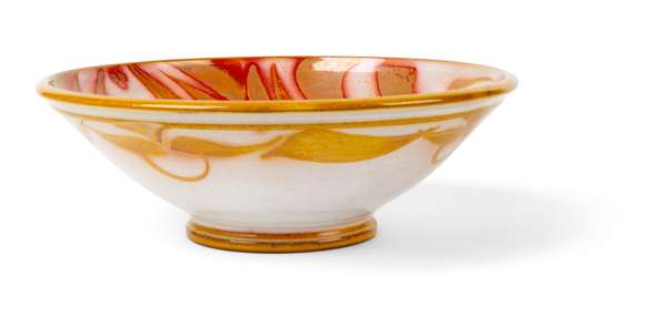 painted monogram and date mark, earthernware, lustrous gold and rust red abstract painted design