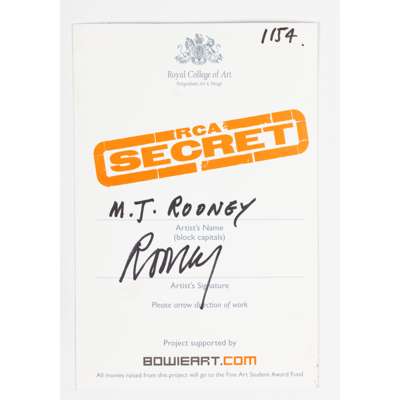 Cooper: signed in pen (to reverse), woodcut and collage on RCA Supplied postcard; Rooney: signed in pen (to reverse), watercolour and gouache on RCA supplied postcard; Bellany: signed in pencil (to reverse); ink and wash on RCA supplied postcard,