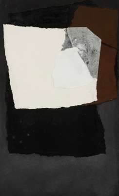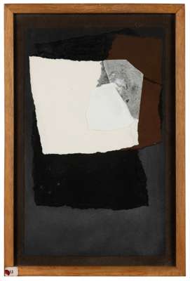 signed and dated on artist's label (to reverse), paper collage mounted on hardboard