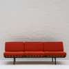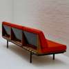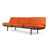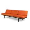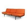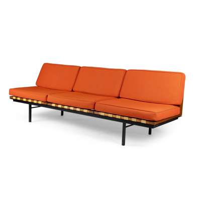 enamelled steel frame with three mahogany seat frames, Pirelli webbing, and upholstered cushions