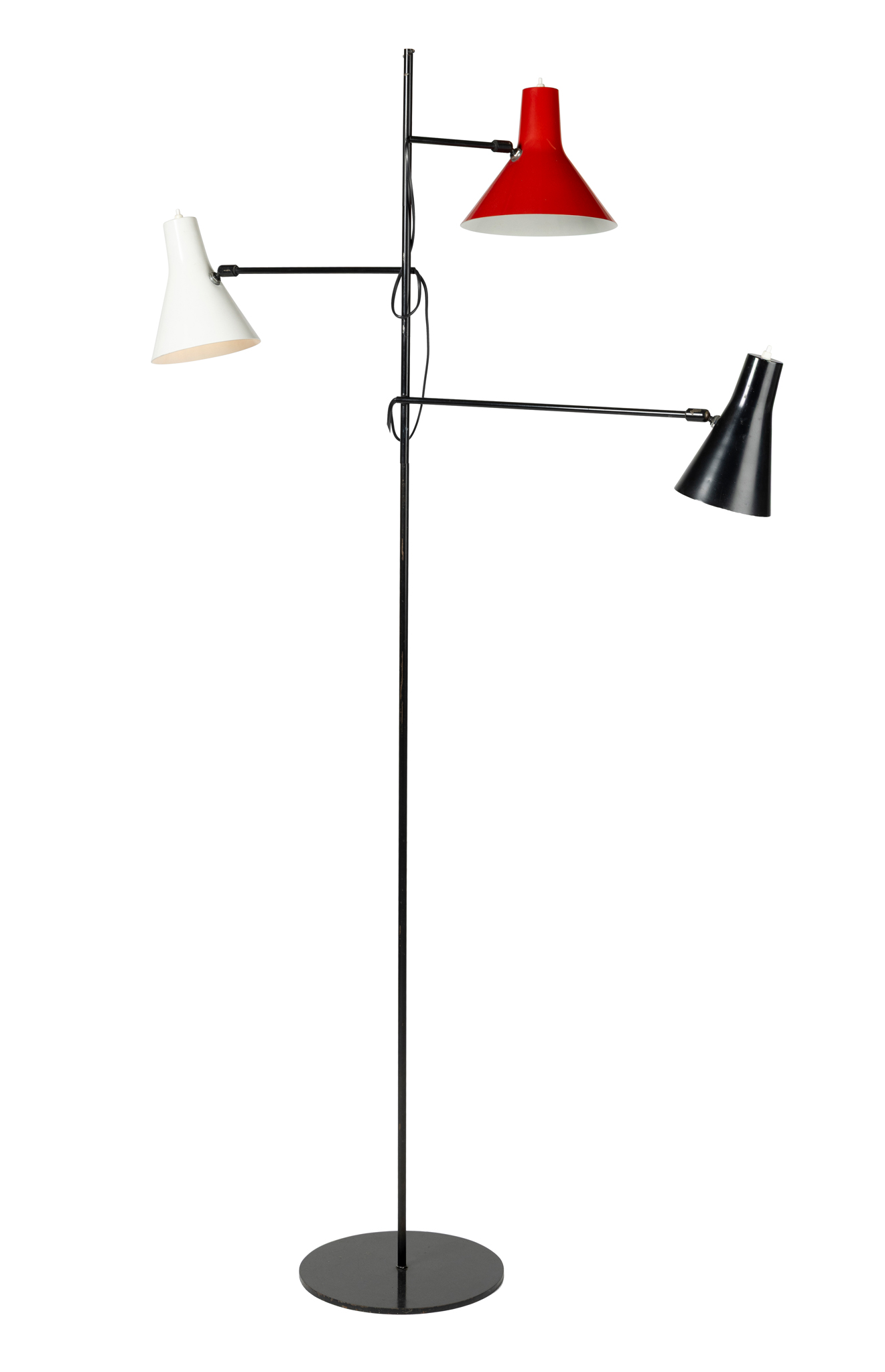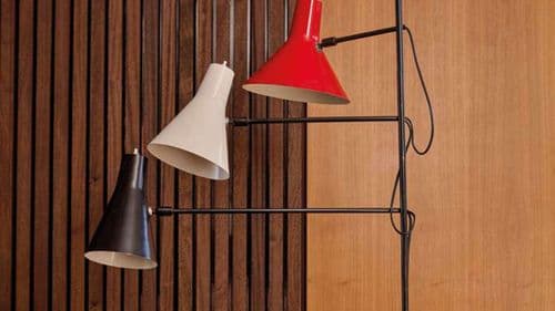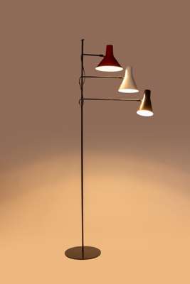 Schottlander’s early output included a number of distinctive multi-arm lamps produced in very small numbers, often assembled using carefully balanced metal frameworks and adjustable shades. The present example, likely dating from around the mid-1950s, demonstrates his characteristic approach. Rising from a slender vertical structure, three arms extend at varying heights and support coloured metal shades, each adjustable to direct light as required. The use of different coloured shades reflects the optimistic palette associated with post-war British design and recalls the aesthetic atmosphere of the Festival of Britain era.