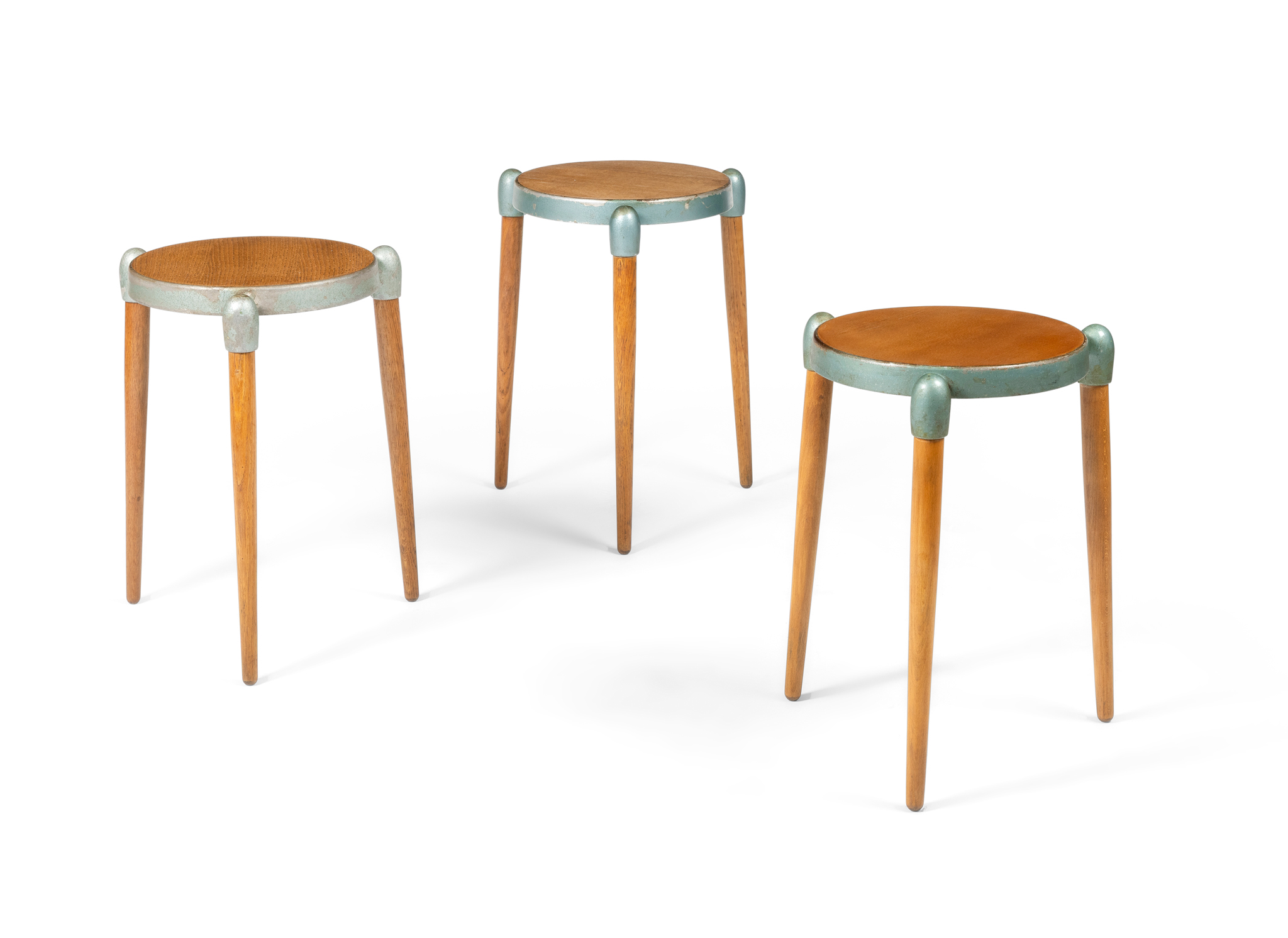 each cast GERALD SUMMERS REGISTERED DESIGN NO. 871987 (to underside), cast aluminium, two with oak legs and veneered top, the other with beech legs and veneered top