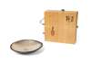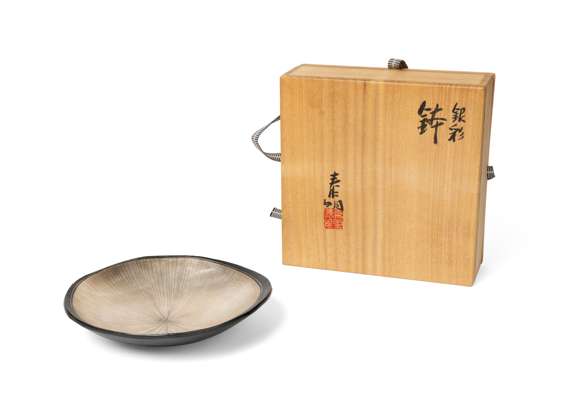 pearlescent Taimei glaze with sgraffito decoration, together with signed wooden box