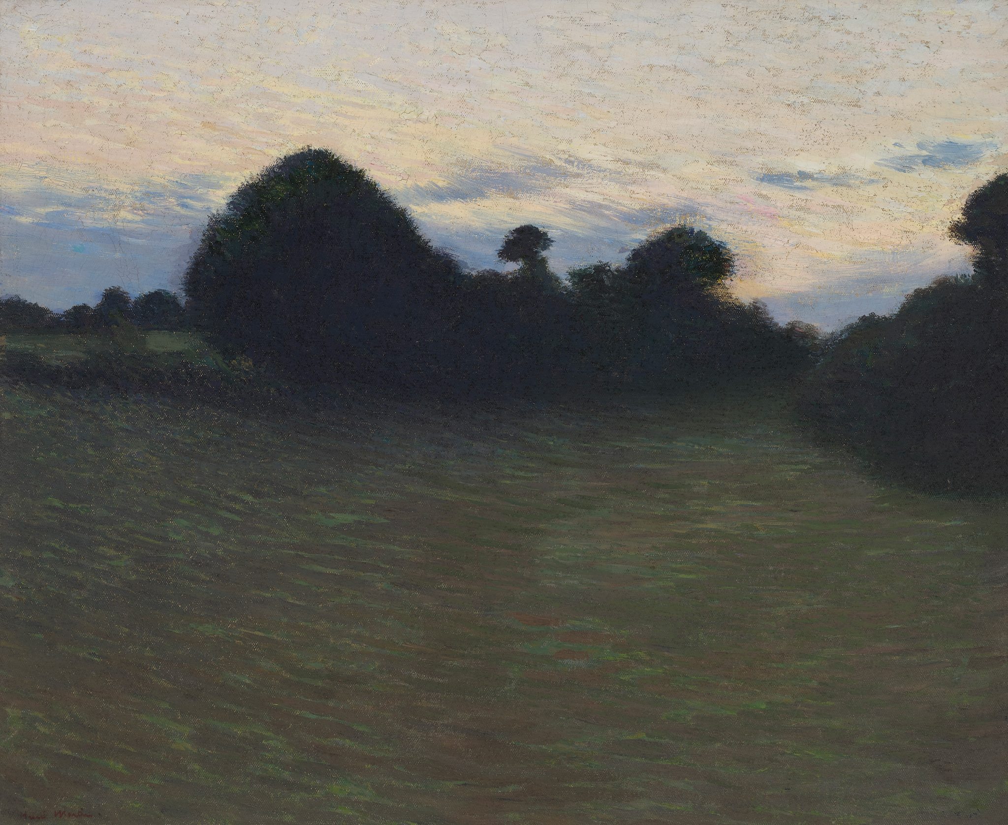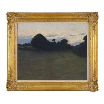 Martin’s Paysage Crépuscule was painted relatively early on in his long and distinguished career, although after he had already achieved his breakthrough at the Paris Salon (at the time, the key measure of success), with his first medal awarded in 1883, followed by a solo exhibition in 1886. Critics and the public were enamoured with Martin’s eclectic style that took in hints of Impressionism (by then well established) and the more recent experiments in Pointillism that had pushed Impressionism closer to abstraction, combining it with an atmosphere more redolent of Puvis de Chavannes and the Symbolists, which lends his work a dream-like quality. Paysage Crépuscule is a perfect example of this: it has none of the bright dryness of Seurat, the dots of colour don’t sit still with optic precision, rather they move and sway as if held on a breeze. And Martin’s choice of dusk lends a narcotic heaviness to the trees and the grass. It’s as if a storm - of which there is no sign in the clear blue sky – is gathering within the woods, drawing the grass of the field into its thrall. Dusk is, of course, the witching hour, so beloved of Magritte, when the sky remains in the day, whilst the earth had fallen into night –something that the French crépuscule seems to capture better than its English translation. dusk. It is the perfect time for an artist like Martin, who wanted to imbue landscape with a certain strangeness, to fill it with mystery.