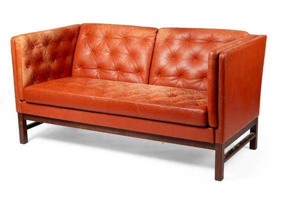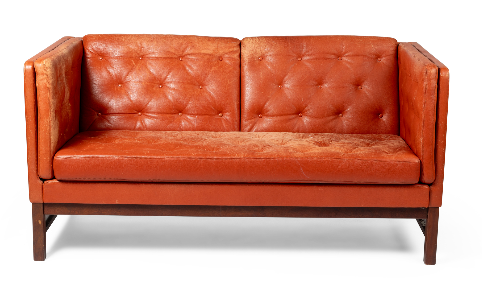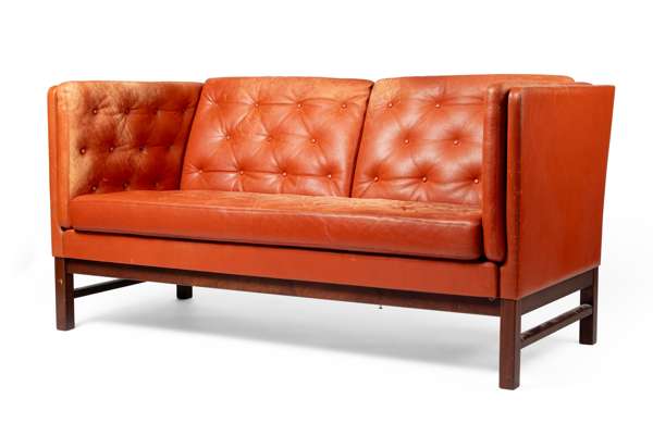 model EJ315, manufacturer's applied label (to underside), mahogany and leather upholstery