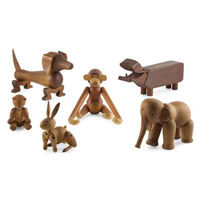 the hippo, elephant, rabbit, bear and monkey stamped KAY BOJESEN / COPYRIGHT / DENMARK, oak and teak
