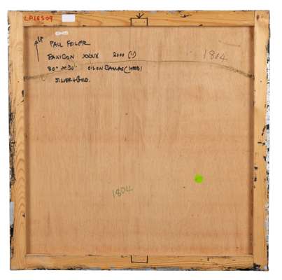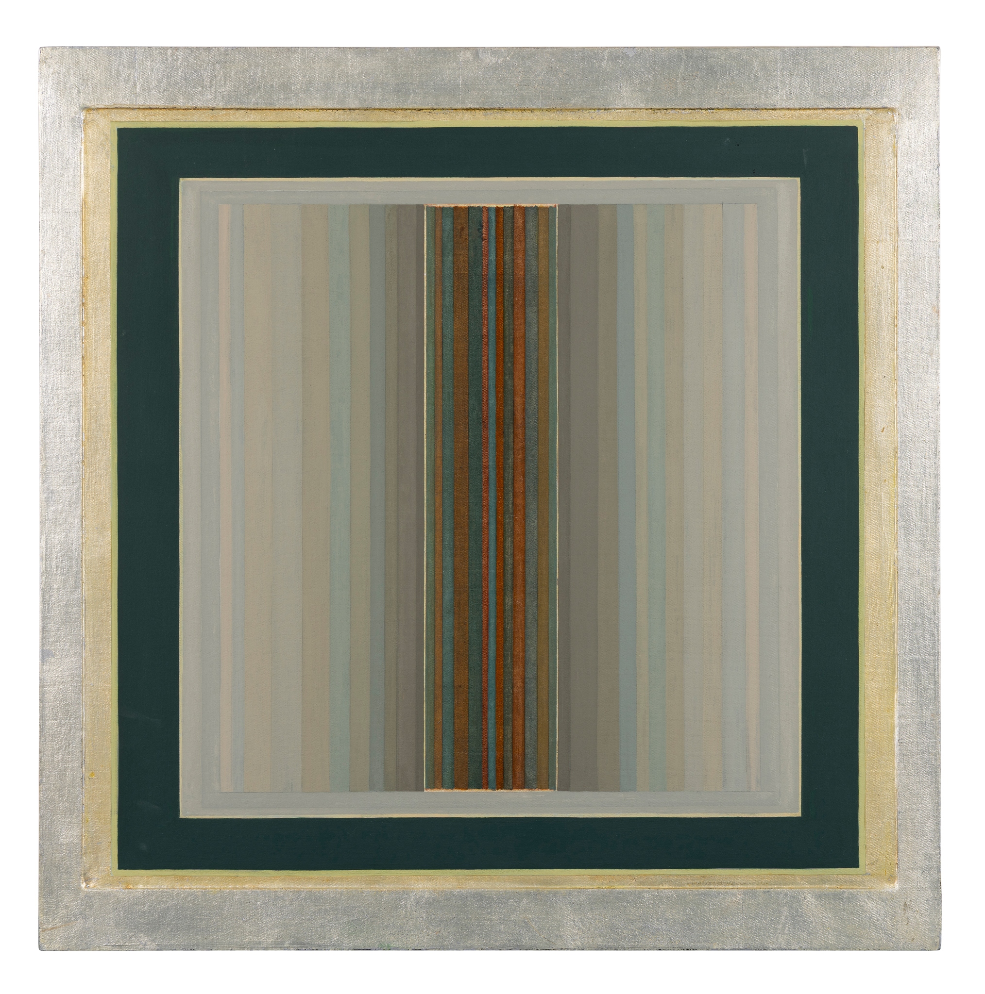 signed, titled and dated in pen (to reverse), oil and gold paint on canvas laid on board in Artist's silver-painted frame